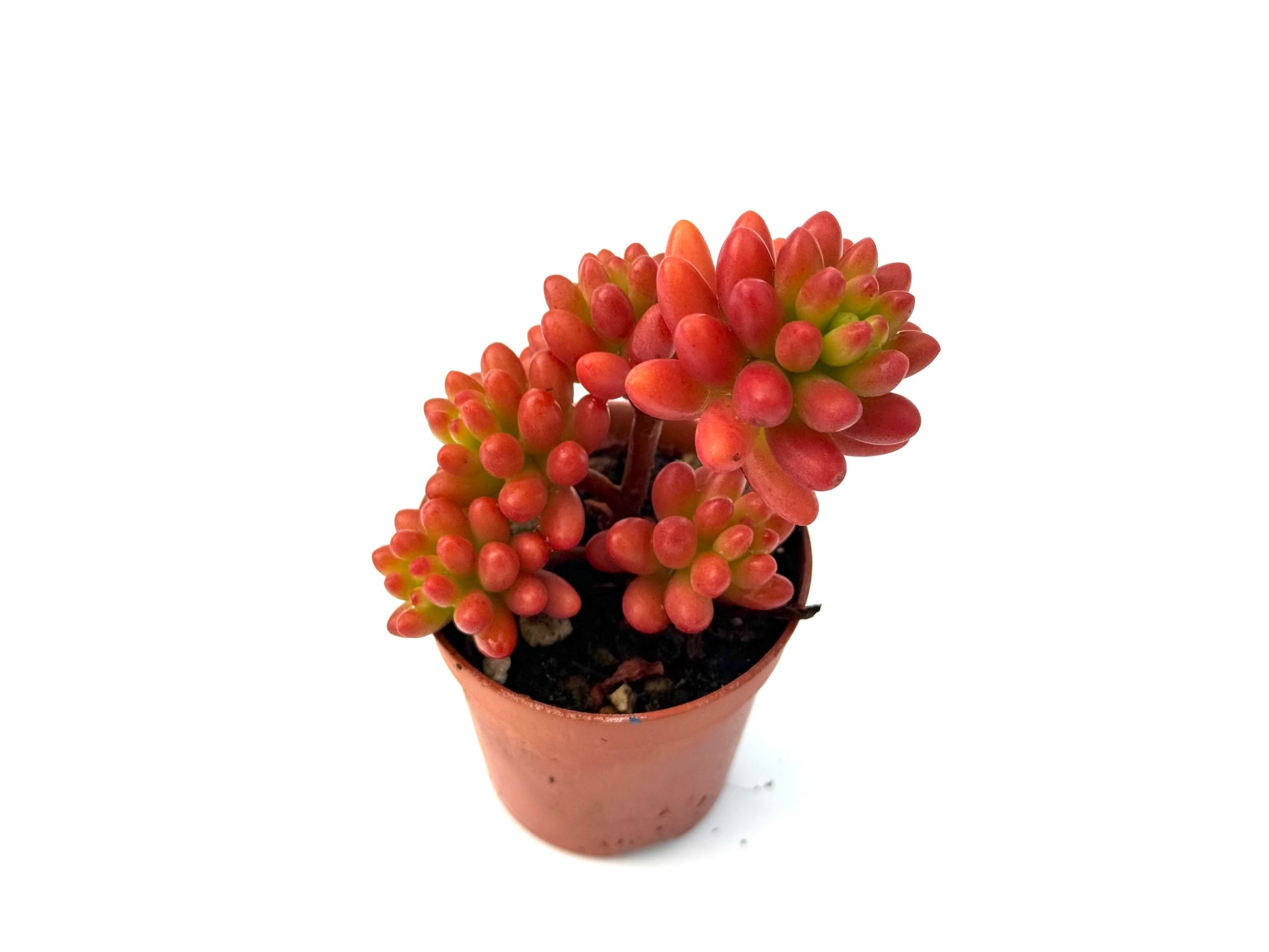 El Sedum rubrotinctum, originario de México, es una suculenta de la familia Crassulaceae que destaca por sus hojas carnosas en forma de pequeñas bolitas o “gominolas”. Su coloración varía del verde brillante al rojo intenso en los bordes cuando recibe suficiente sol, lo que la convierte en una planta alegre y decorativa. Conocida también como “Dedos de Jalea”, es perfecta para dar un toque divertido y colorido a tu colección.